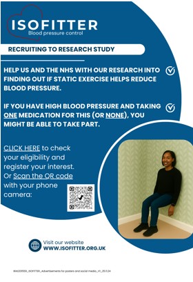 Aim of the research: We are recruiting ~500 participants across NHS primary and community services alongside direct to participant recruitment to confirm if wall-squat isometric exercise (IE) training will reduce resting blood pressure (BP) in people with Stage 1 and 2 hypertension. IE involves holding a fixed position for a short period of